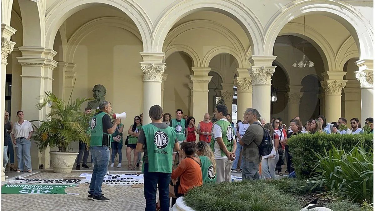 Tras una asamblea realizada en el patio de la Casa de Gobierno, trabajadores de ATE, junto a miembros de la Asociación Gremial del Magisterio de Entre Ríos (Agmer), marcharon hacia los despachos del ministro de Economía, Fabián Boleas, y del ministro de Gobierno y Trabajo, Manuel Troncoso.
