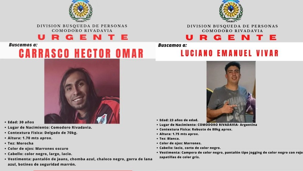 Desde el 16 de octubre, se encuentran desaparecidos Luciano Emanuel Vivar, de 23 años, y Héctor Omar Carrasco, de 30 años, en Comodoro Rivadavia. Esta situación se desarrolla en simultáneo a la desaparición de los jubilados Juana Morales y Pedro Kreder, lo que ha llevado a que las autoridades intensifiquen las labores de búsqueda.