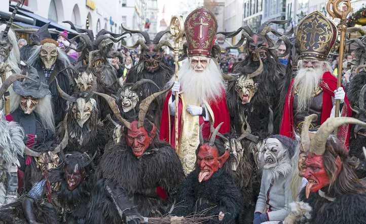 La noche más temida es la denominada Krampusnacht, que se celebra el 5 de diciembre, en la víspera del día de San Nicolás. En esa fecha, hombres disfrazados de Krampus recorren las calles con máscaras aterradoras, campanas y antorchas, protagonizando desfiles que fusionan ritual, teatro y tradición popular.