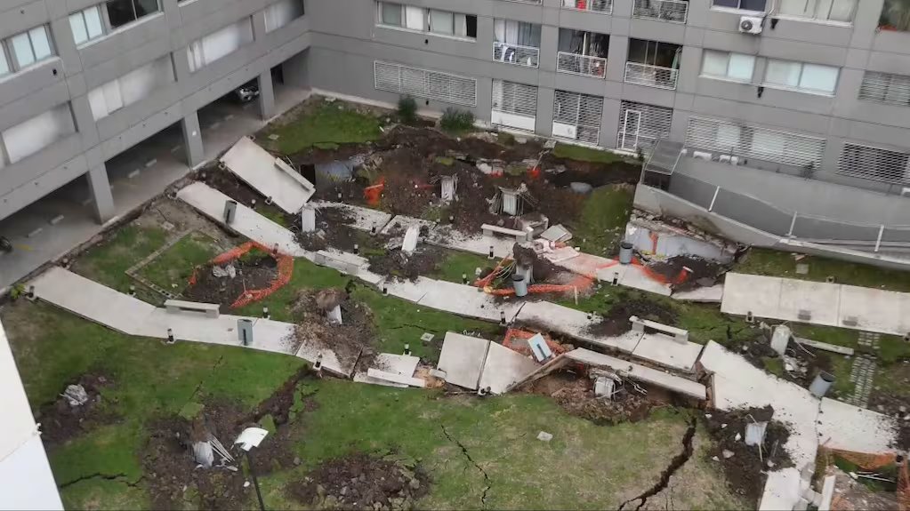 El colapso ocurrió en un perímetro que rodea el complejo de viviendas y funciona como patio interno. Por razones que aún son materia de investigación, el terreno se derrumbó sobre el estacionamiento que está debajo. Tras el impacto, 65 vehículos que se guardaban en el garaje quedaron aplastados.